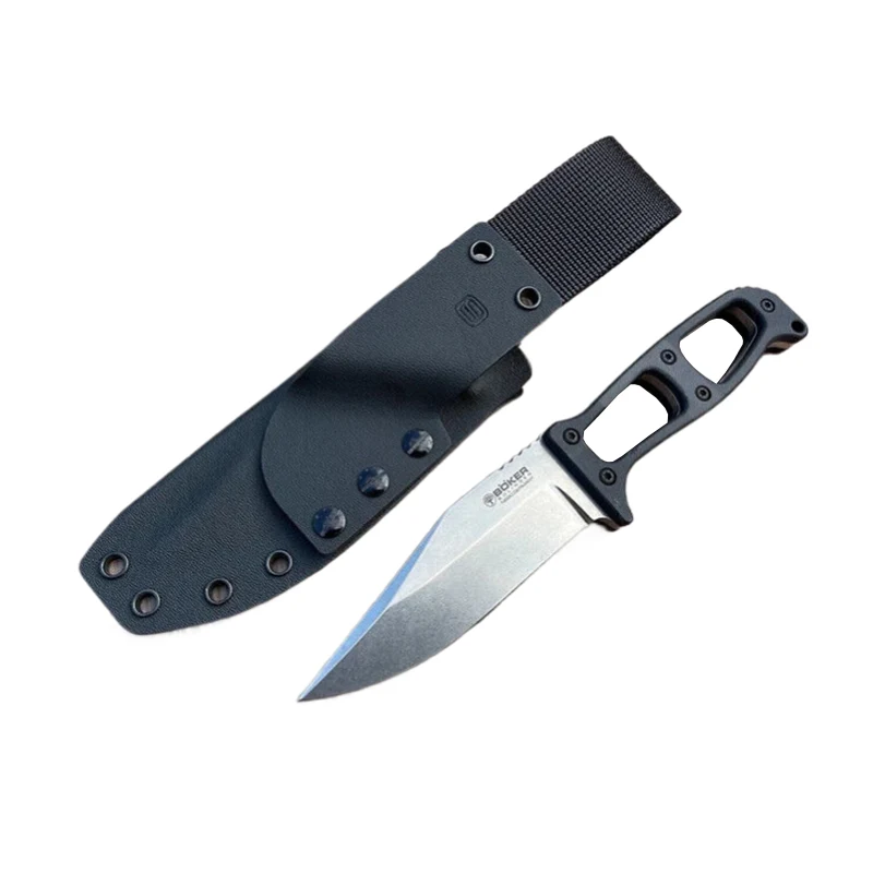 Das Messer mit feststehender Klinge und Kydexscheide ist extra schlank gefertigt und verfügt an der Spitze über ein ausreichend großes Ablaufloch, damit Schmutz und Haare ausgespült werden können. Die Scheidenöffnung wurde so geformt, dass das Messer sicher sitzt und dennoch mit einer Hand ohne großen Widerstand herausgezogen werden kann.