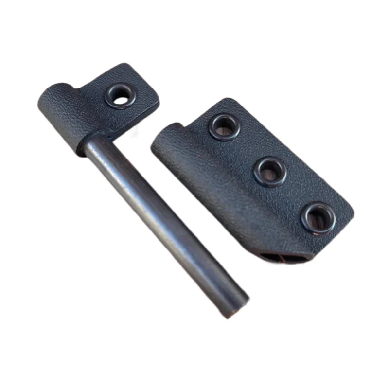 Um das Campingmesser klassisch horizontal oder vertikal am Gürtel zu befestigen, entscheiden sich meine Kunden meist für einen Multi-Lok. Möchte man das Messer etwas tiefer tragen, empfehle ich einen Nylongurt mit Kydex-Halterung oder einen Verlängerungsclip. Klettverschluss ist ideal, um das Messer quer über den Gürtel zu tragen. Auch für die Befestigung des Messers am Riemen des Rucksacks ist Klettverschluss eine praktische Lösung. Zusätzlich zur Kydexscheide kann ich einen Feuerstahlhalter anbringen, wahlweise mit Feuerstahl (80mm lang).