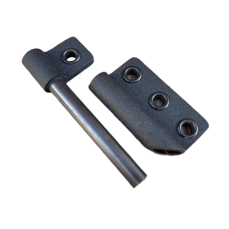 Um das horizontale Messer auf herkömmliche Weise horizontal oder vertikal am Gürtel zu befestigen, entscheiden sich meine Kunden normalerweise für einen Multi-Lok. Möchte man das Messer etwas tiefer tragen, empfehle ich einen Nylongurt mit Kydex-Halterung. Klettverschluss ist ideal, um das Messer quer über den Gürtel zu tragen. Auch für die Befestigung des Messers am Riemen des Rucksacks ist der Klettverschluss eine praktische Lösung. Zusätzlich zur Kydexscheide kann ich einen Feuerstahlhalter anbringen, wahlweise mit Feuerstahl (80mm lang).