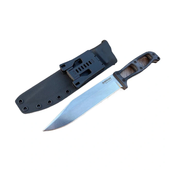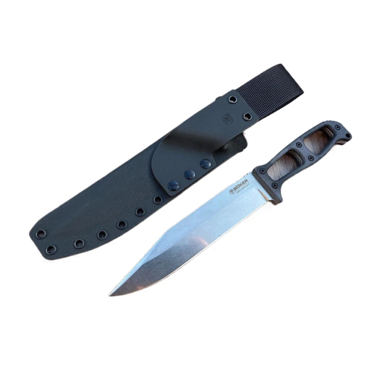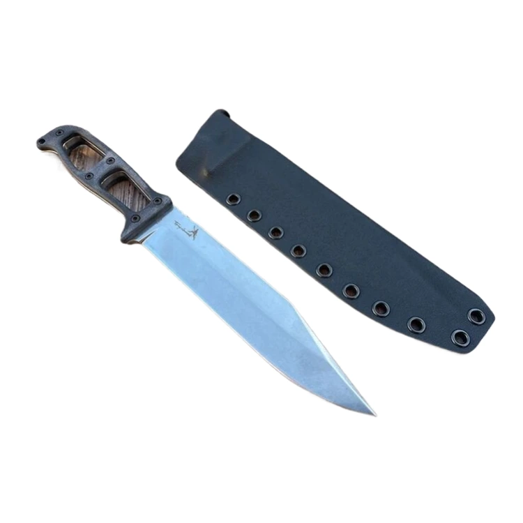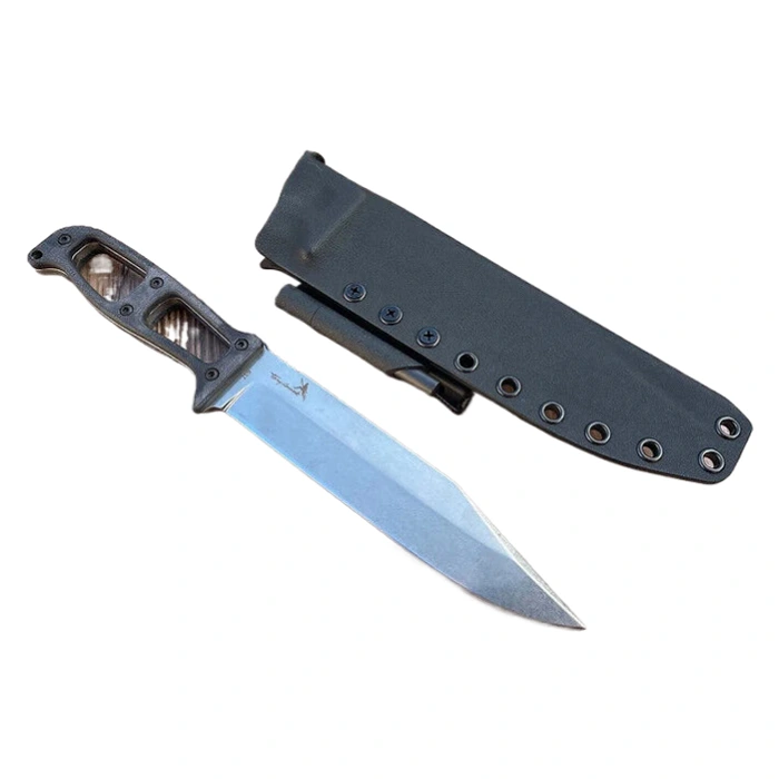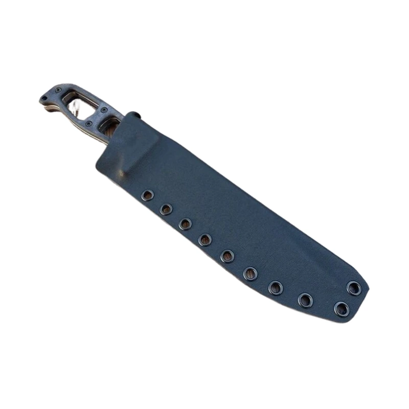 Die Messerscheidehülle ist extra schlank gefertigt und verfügt an der Spitze über ein ausreichend großes Ablaufloch, damit Schmutz und Haare ausgespült werden können. Die Scheidenöffnung ist so geformt, dass das Messer sicher sitzt und dennoch mit einer Hand ohne großen Widerstand gezogen werden kann. Aufgrund der Größe und des Gewichts des Messers empfehle ich einen Gürtelhalter mit Nylonbändern. Wenn Sie einen Multi-Lok bevorzugen, kann dieser dank der Ösenanordnung horizontal, vertikal und diagonal um 360° drehbar befestigt werden – so stehen Ihnen alle Tragemöglichkeiten offen.