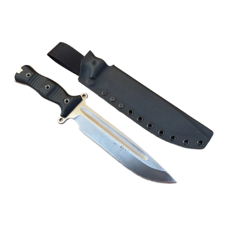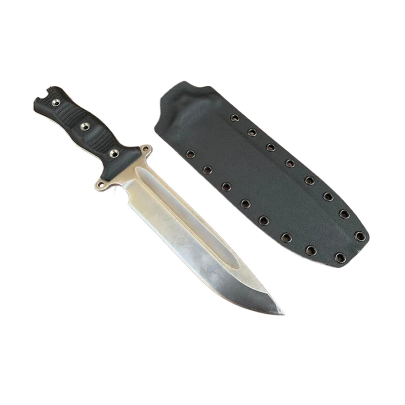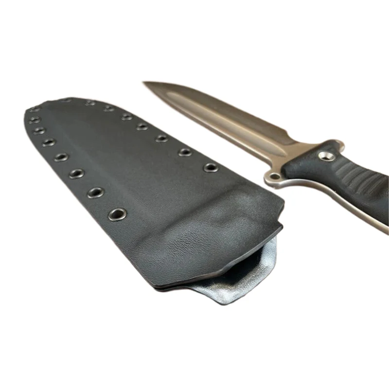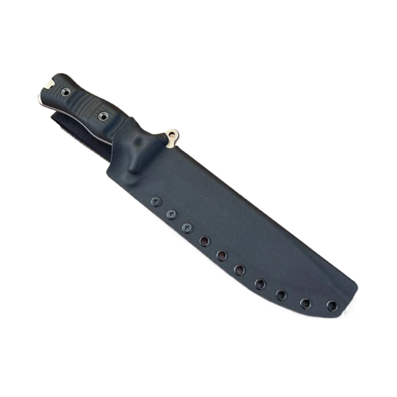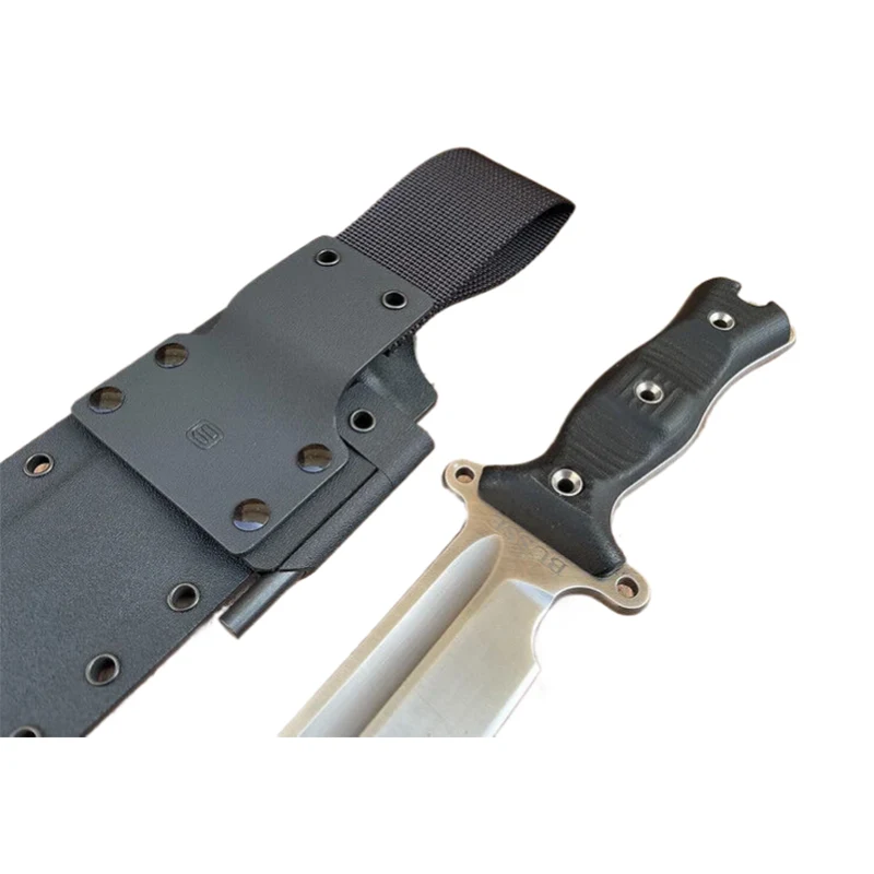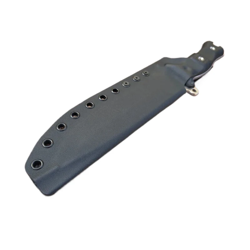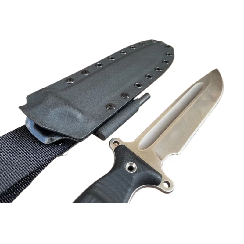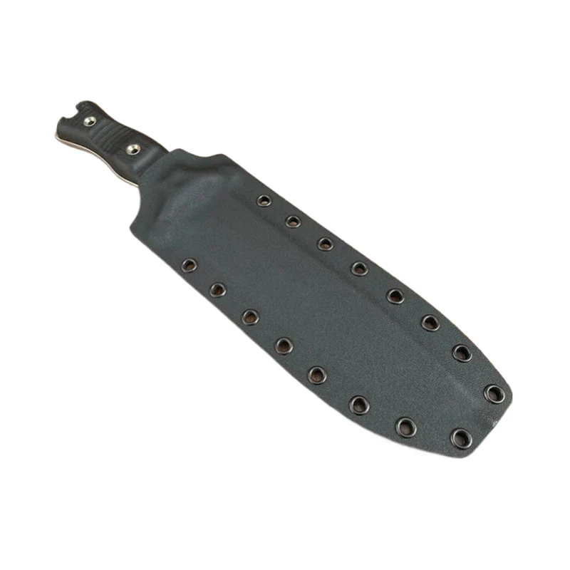 Die Blutrille des Messers wurde mit Modelliermasse gefüllt, sodass die Kydexscheide eine absolut glatte Oberfläche erhält. Die Messer mit Scheide können mit Molle-Riemen als Gürtelhalterung ausgestattet werden, sodass das Messer auch an Molle-Systemen, wie z. B. Rucksäcken, befestigt werden kann. Die Molle-Gurte eignen sich auch zum Tragen des Messers am Gürtel.